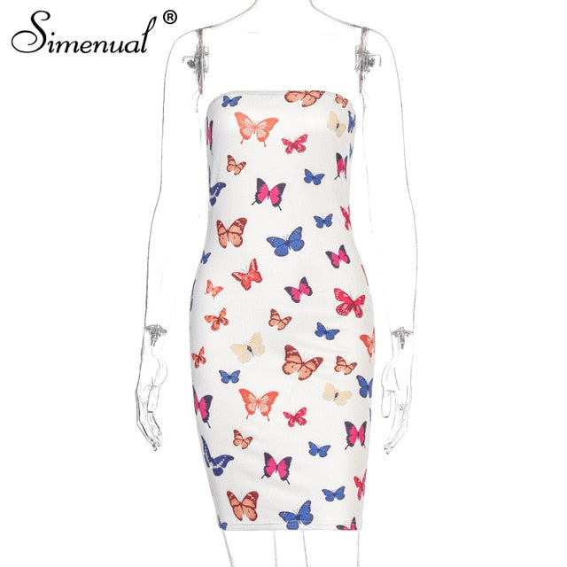 Simenual Butterfly Print Strapless Women Party Dress Sexy Hot Clubwear Bodycon Skinny Wrap Chest Mini Dresses 2020 Fashion Slim