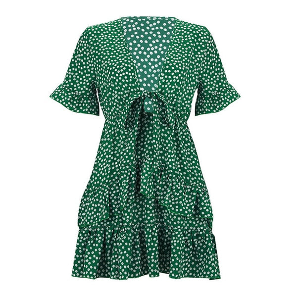Brand Name: hiriginMaterial: PolyesterSilhouette: Fit and FlareModel Number: dressSeason: SummerNeckline: V-NeckSleeve Length(cm): ShortSleeve Style: REGULARGender: WOMENDecoration: RufflesStyle: BohemianWaistline: empirePattern Type: DOTDresses Length: Above Knee, Mini
